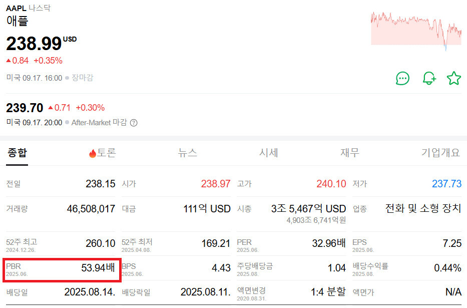 애플(Apple)의 PBR은 2025년 9월 현재 53.94에 달합니다. 삼성전자와 비교하면 어마어마한 차이죠. 애플은 단순히 제품을 판매하는 기업을 넘어, 막강한 브랜드 파워와 생태계를 기반으로 높은 성장성을 인정받고 있습니다. 시장은 애플의 유형 자산(순자산) 가치보다 미래에 창출할 무형의 가치에 훨씬 더 높은 점수를 주고 있기 때문에 PBR이 매우 높게 형성된 것입니다.