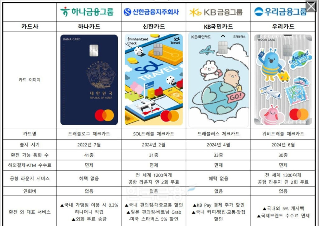 | 구분 | 하나카드 트래블로그 | 신한 SOL 트래블 체크카드 | 트래블월렛 트래블페이 |